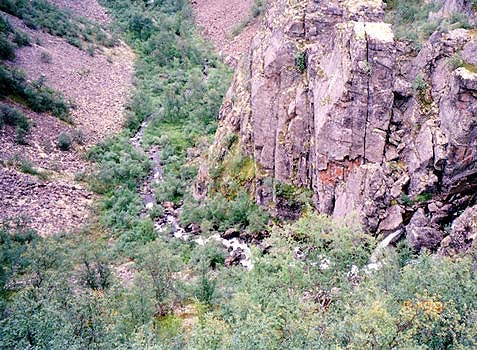 Kanjonin pohjalla virtasi joki joka saa alkunsa jostain takaoikealta.