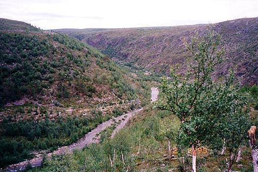 Sivujoki yhtyy Kevojokeen. Fiellun putous jää juuri kuvan ulkopuolelle vasemmalle. Alhaalla näkyy yöpymispaikka, jolla vietimme toisen yön. Reitti puolestaan jatkuu taka-alalla vasemmalla näkyvää rinnettä ylös ylätasangolle.