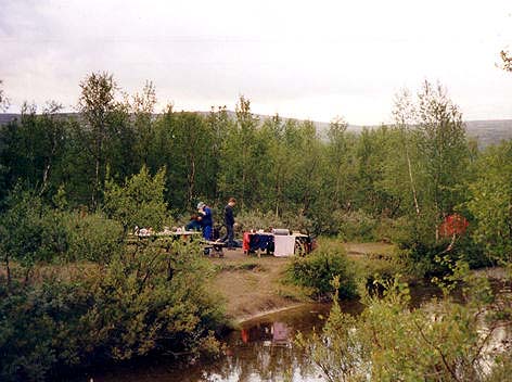 Ensimmäisellä yöpaikka pienen puron varrella oli varustettu pöydin, huussein ja roskakatoksin.